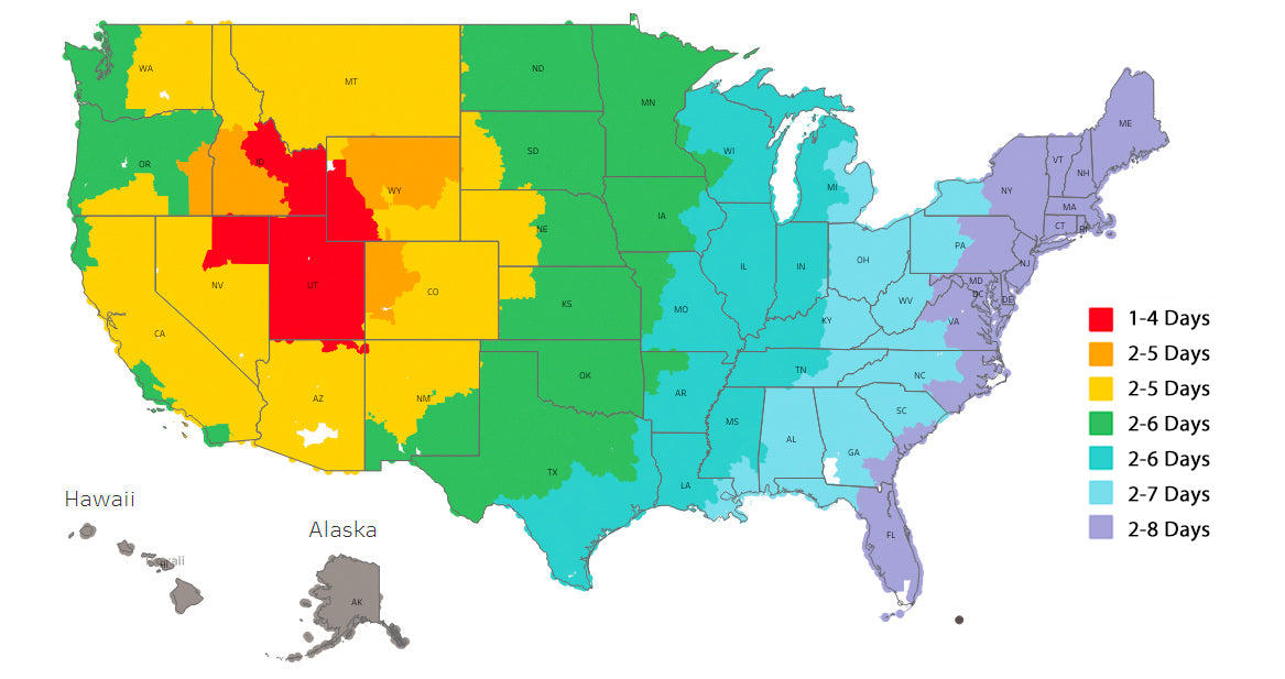 Standard shipping will typically takes about 3-5 business days. See shitty map our gRaPhIc DeSiGnEr made below for more accurate shipping times.